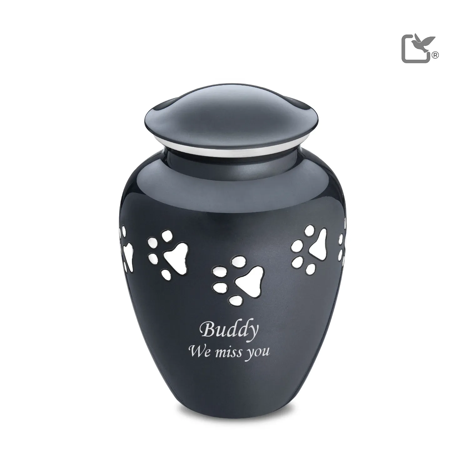 De zwarte kleur van de urn met zilveren pootafdrukken rondom en met zilveren sierrand zorgt voor een stijlvolle en elegante uitstraling.