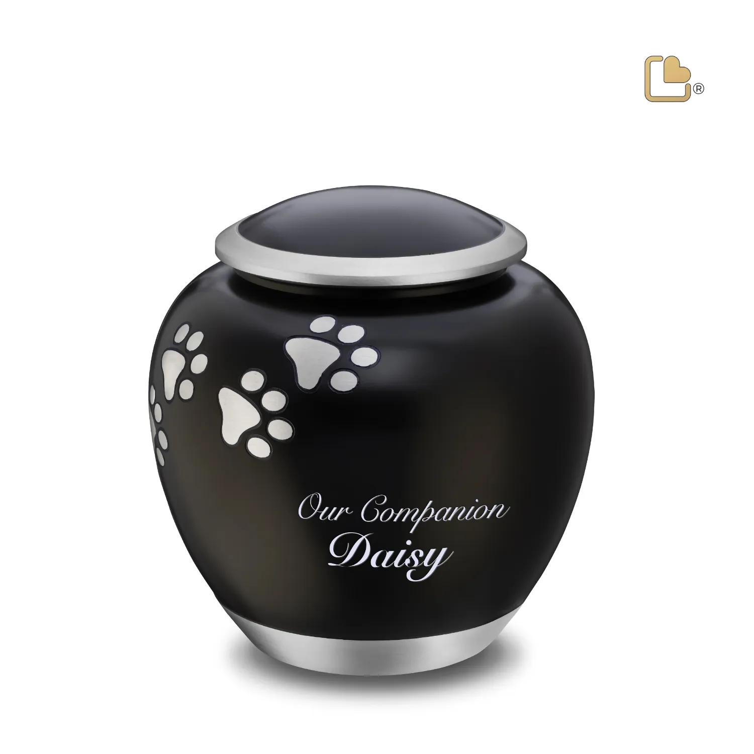 De zwarte kleur van de urn met zilveren pootafdrukken rondom en met zilveren sierrand zorgt voor een stijlvolle en elegante uitstraling.
