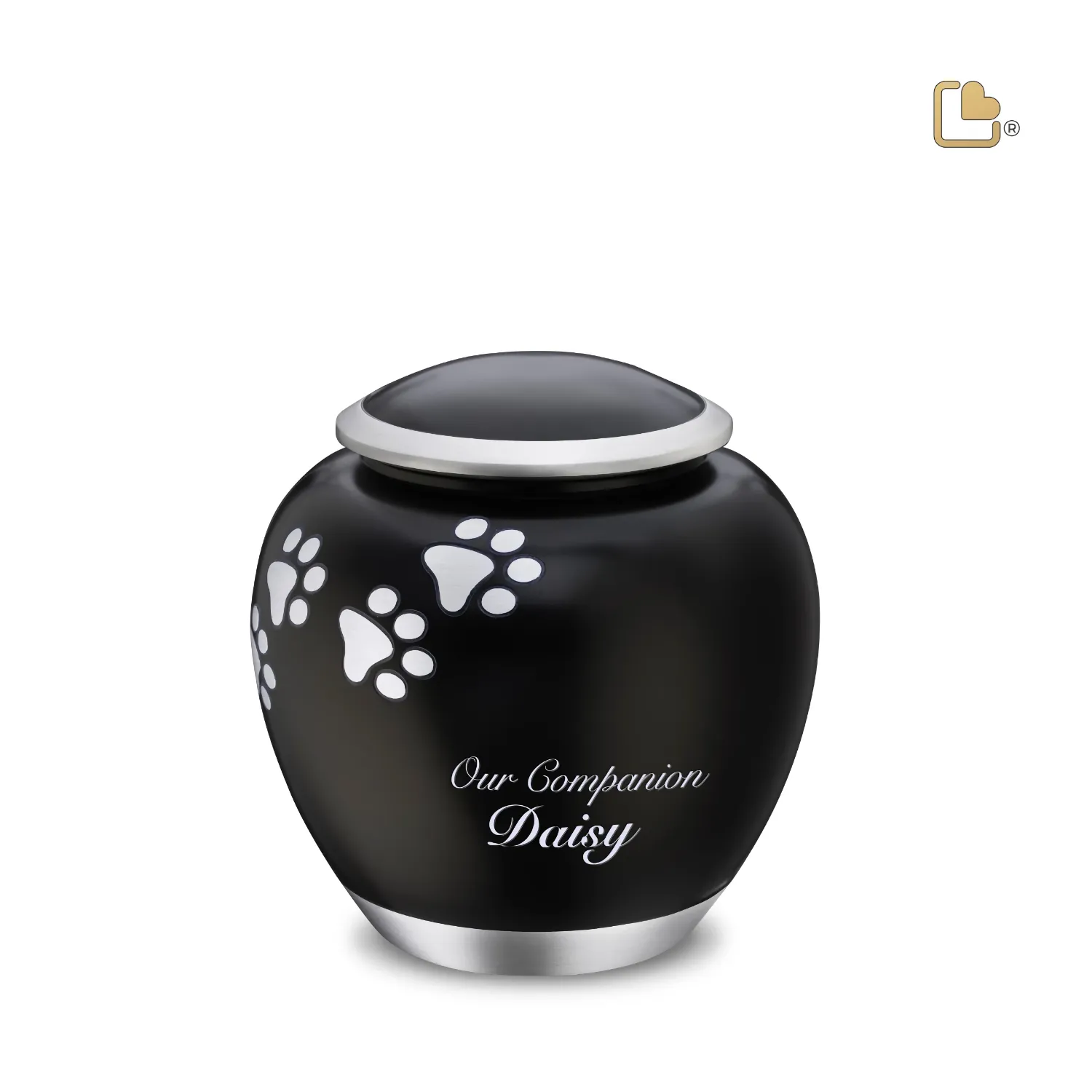 De zwarte kleur van de urn met zilveren pootafdrukken rondom en met zilveren sierrand zorgt voor een stijlvolle en elegante uitstraling.