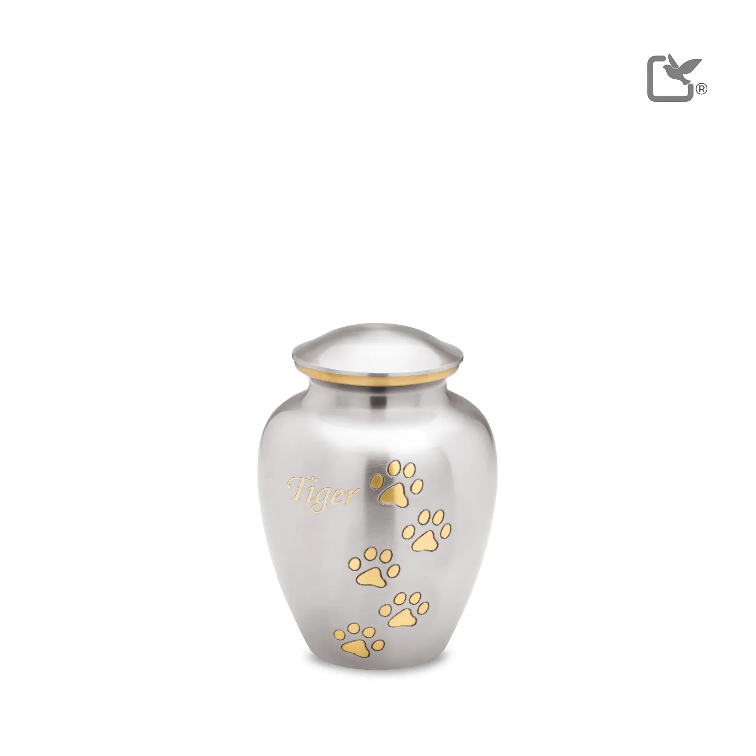 Met zijn zware kwaliteit messing en premium glossy coating, is deze urn van de hoogste kwaliteit en biedt het de bescherming die uw huisdier verdient. Het ontwerp is zorgvuldig gekozen om een sfeervolle uitstraling te geven die perfect past bij uw interieur. De zilver kleur van de urn met zilveren pootafdrukken en zilveren sierrand zorgt voor een stijlvolle en elegante uitstraling.