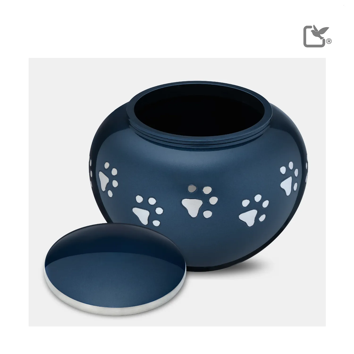 De blauwe kleur van de urn met zilveren pootafdrukken rondom en met zilveren sierrand zorgt voor een stijlvolle en elegante uitstraling.